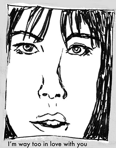 In these works, drawn faces appear alongside brief phrases or fragments of language.